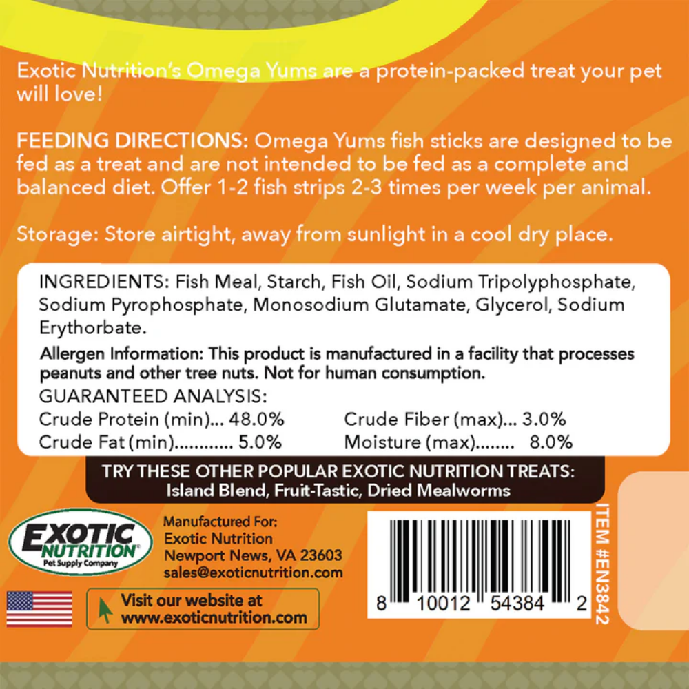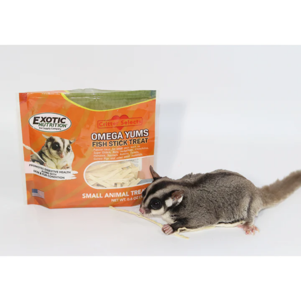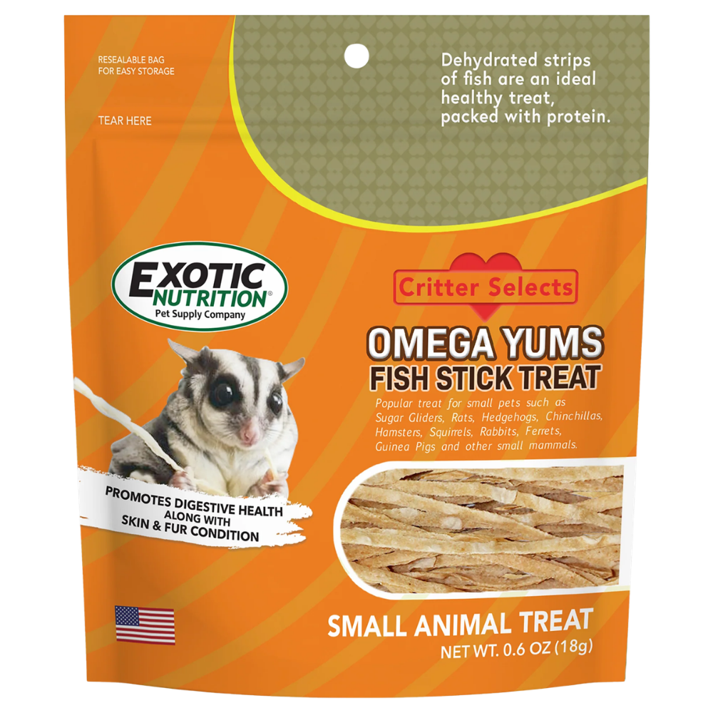 Dale a tu mascota un snack diferente, nutritivo y altamente atractivo con los Omega Yums Fish Sticks de Exotic Nutrition, una golosina elaborada a base de pescado diseñada para pequeños animales.
