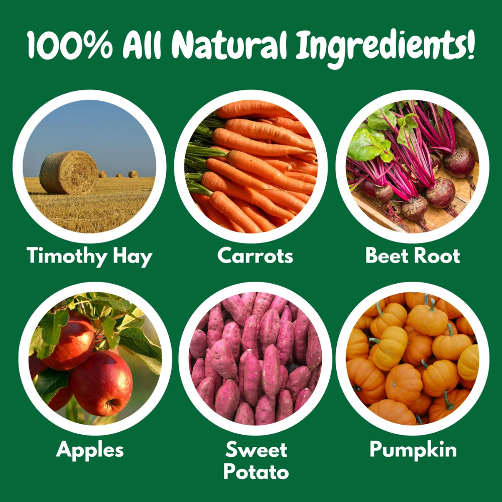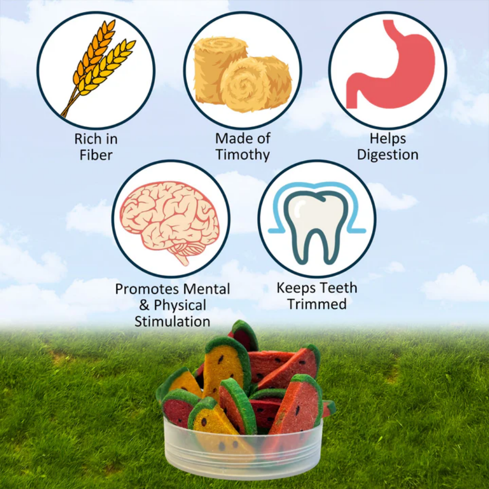 Estas rodajas con forma de sandía están elaboradas con heno Timothy premium y vegetales naturales, proporcionando una excelente fuente de fibra que ayuda a mantener una digestión saludable y dientes fuertes.
